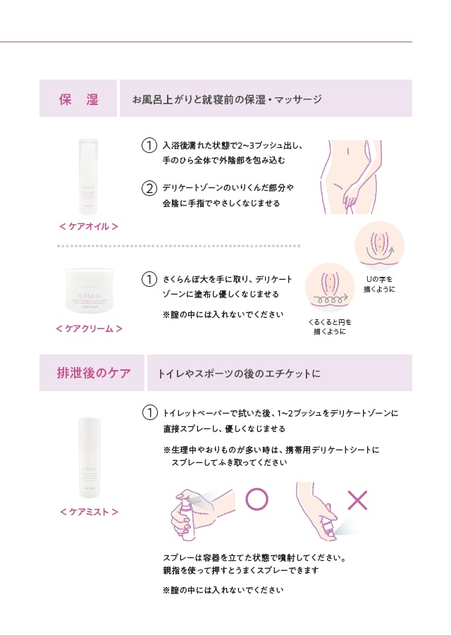 さまざまな症状の改善には清潔と保湿が欠かせません。ケアソープで清潔に、ケアクリームが加齢と共に痩せてしまうデリケートゾーンをぷっくりハリのある肌へと導きます。様々な保湿成分を贅沢に配合したスペシャルなクリームでお肌を整え、デリケートゾーンのエイジングケアにも最適です。
